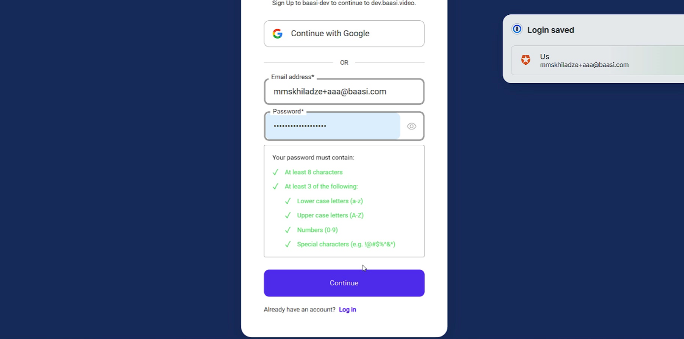 Create a strong password that meets the specified requirements to protect your Baasi account.