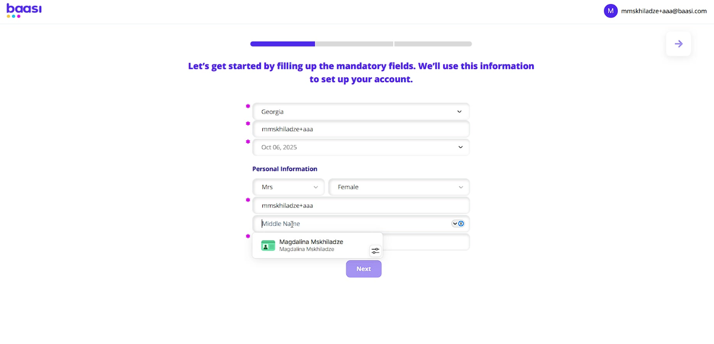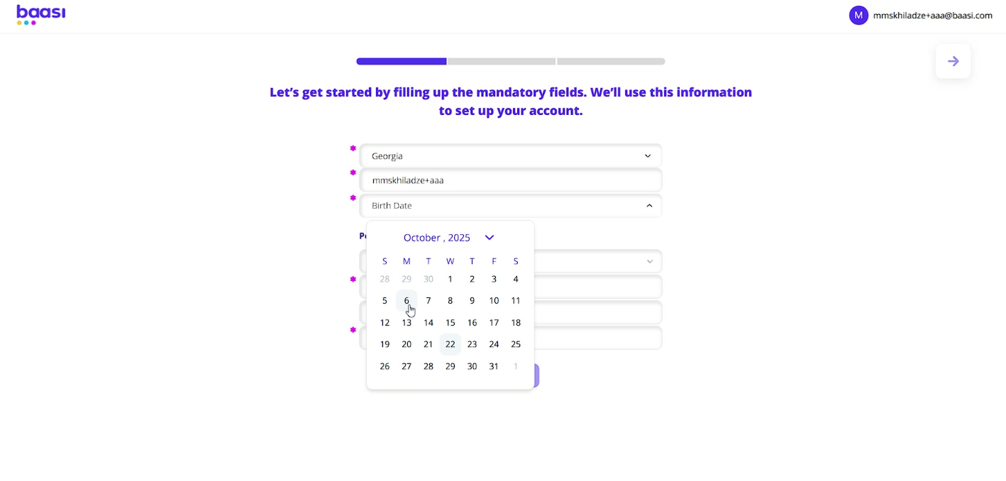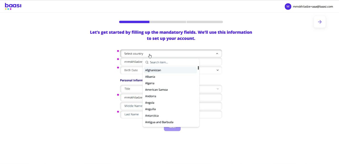 Create a new Baasi user profile by completing a series of data entry and verification steps. Provide your email, set a password, verify your identity, and enter your personal details to establish your account.