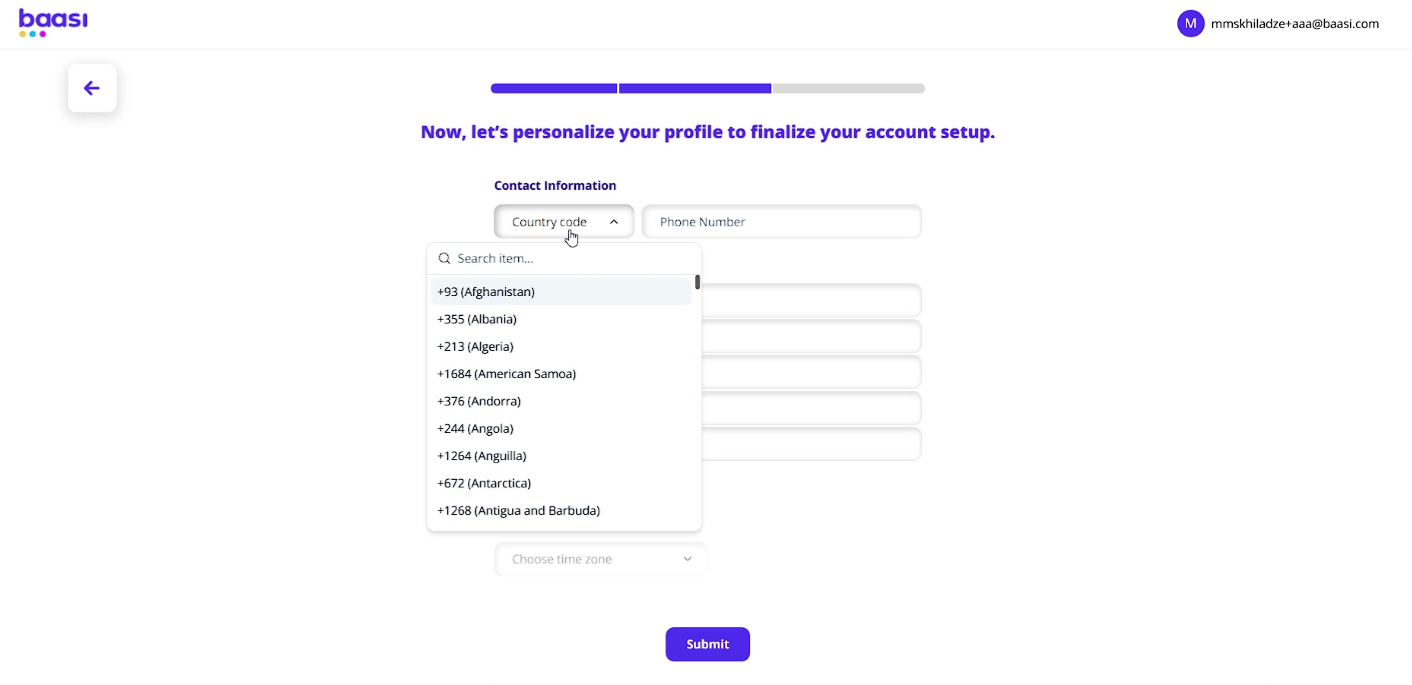 Click the Submit button to finalize your account setup. This action creates your new Baasi user account, granting you access to the platform.